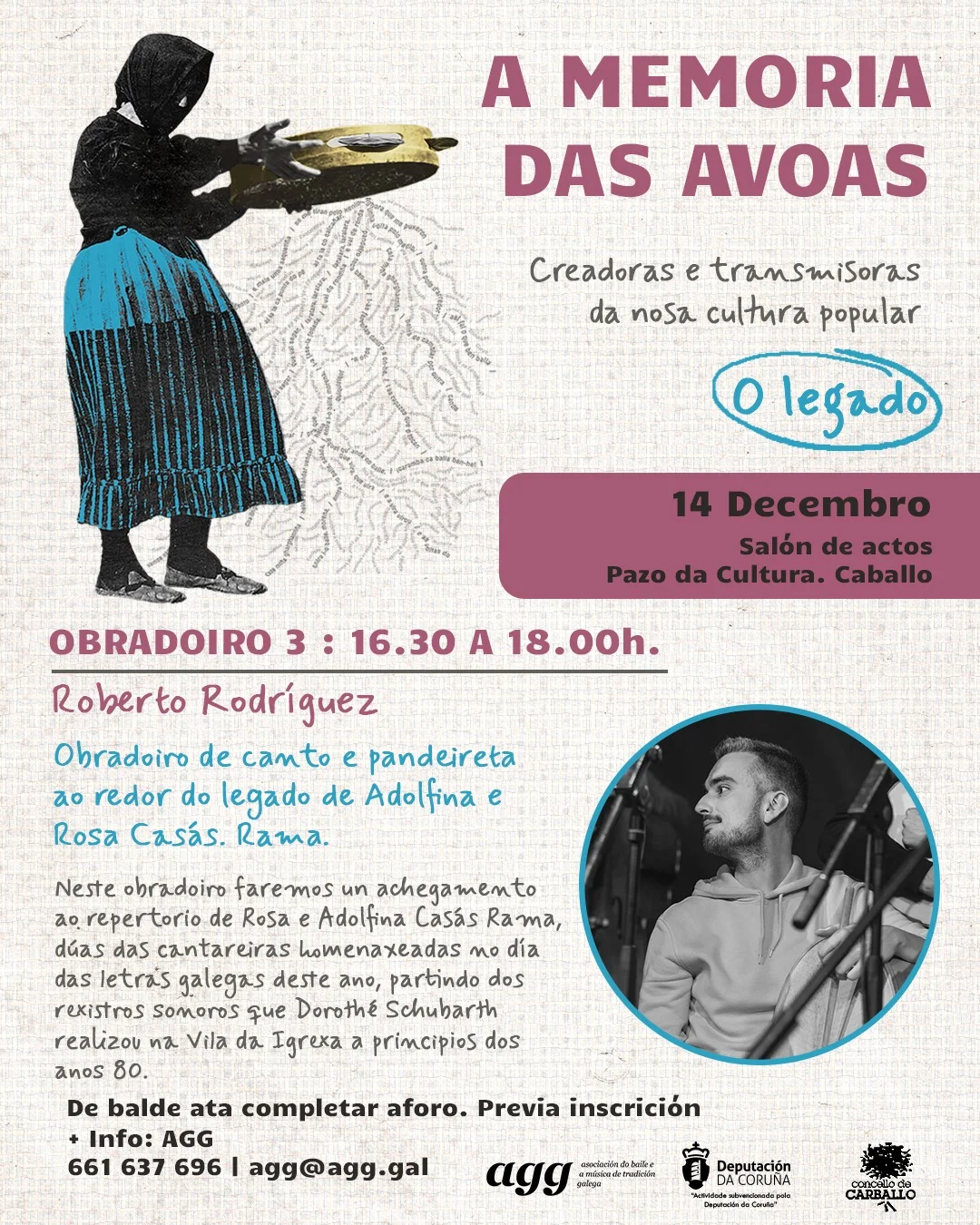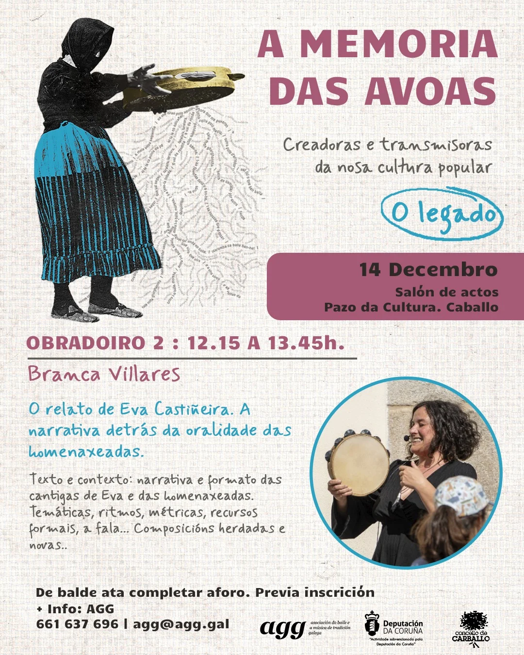 Unha nova cita ao redor da tradición oral no terceiro dos eventos enmarcados dentro da actividade A Memoria da Avoas, que organizamos dende a AGG en homenaxe ás cantareiras protagonistas das nosas Letras Galegas, co obxectivo de preservar e difundir a memoria colectiva que sustenta a nosa identidade cultural.