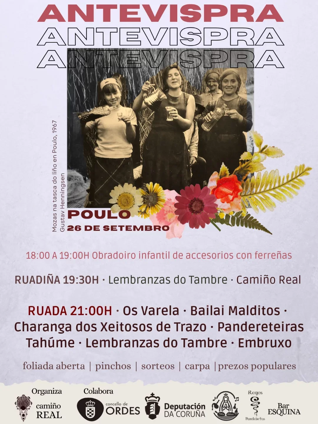 21:00 Ruada con Os Varela, Bailai Malditos, Charanga dos Xeitosos de Trazo, Pandereteiras Tahúme, Lembranzas do Tambre e Embruxo.