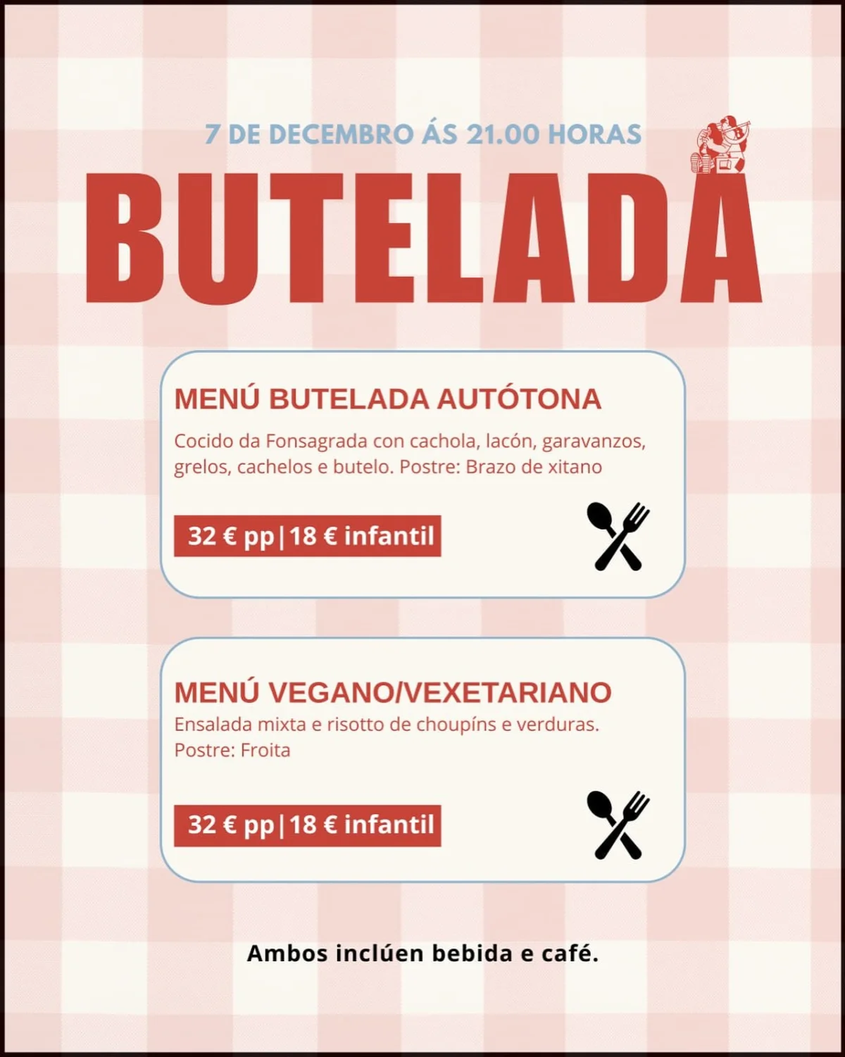 Butelada: cocido da Fonsagrada que consistirá en cachola, lacón, garavanzos, grelos, cachelos e butelo. Sobremesa: brazo de xitano.